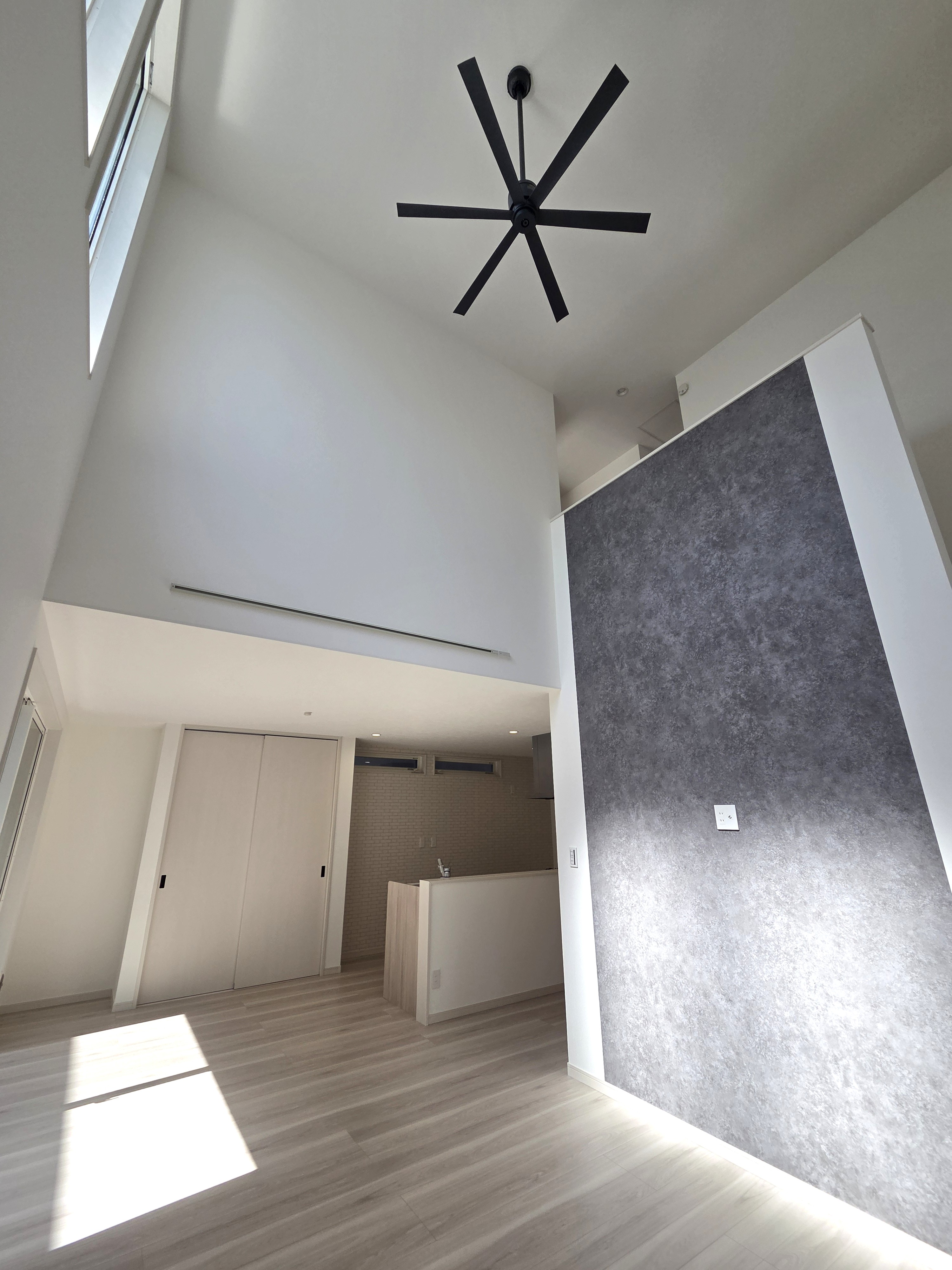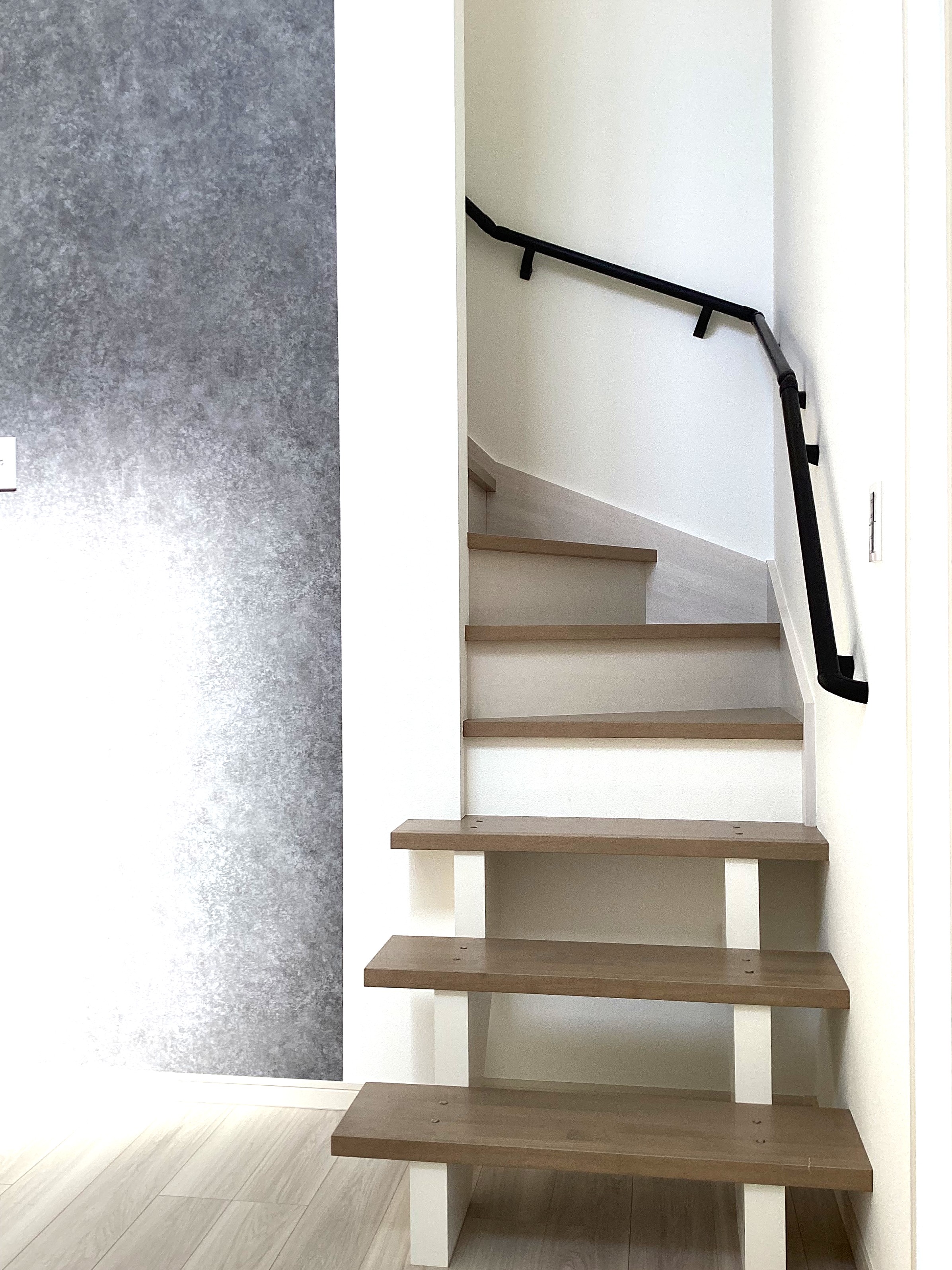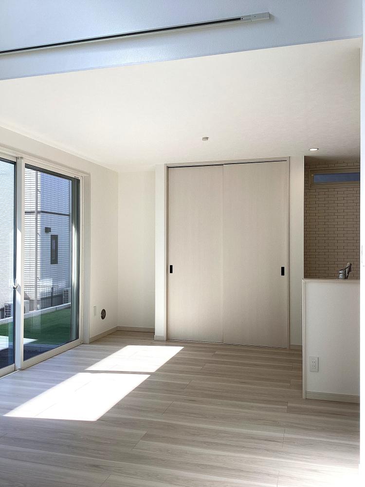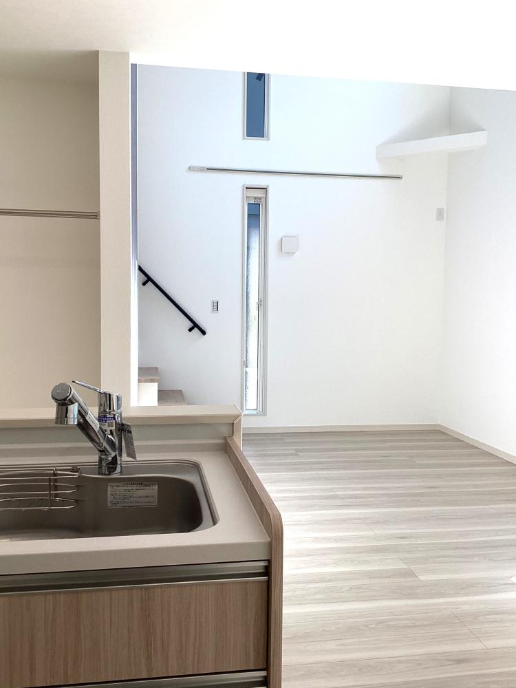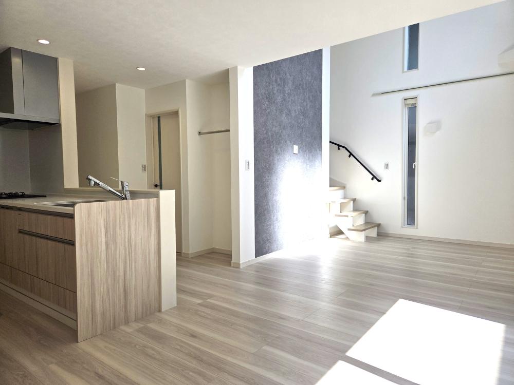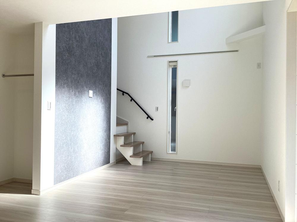 リビング上部は開放感のある吹き抜け!どこにいても家族の気配を感じられるリビング階段を採用!玄関がすっきり整う玄関収納も!子供部屋は、成長に合わせて形を変える可変設計に。家族のライフステージに寄り添い、心地よい距離感をデザインした住まいです。