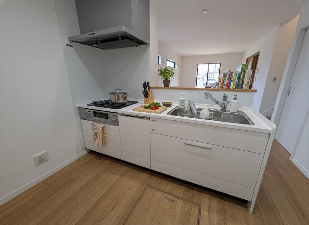 ホワイトを基調としたキッチンは、空間を明るく広く見せ、清潔感のある印象を与えます。自然光や照明を反射しやすく、キッチン全体がすっきりとした雰囲気になります。