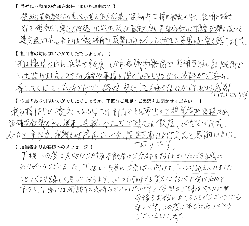 複数の不動産会社へ問い合わせを行った結果、貴社の井口様の初動の早さ、説明の確かさ、そして現地を丁寧にご確認いただいたうえでの査定内容と売却方針のご提案が群を抜いて秀逸でした。